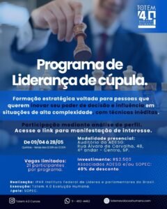 O programa é oferecido pelo IPAR — Instituto Federal de Líderes e Parlamentares do Brasil, em parceria com a Totem 4.0, responsável pela execução da formação.